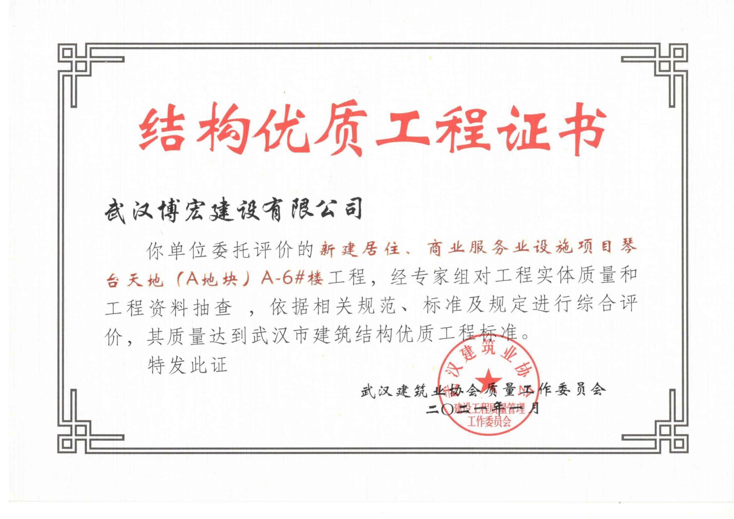 2021年武漢市結構優(yōu)質工程(琴臺天地(A地塊)6棟