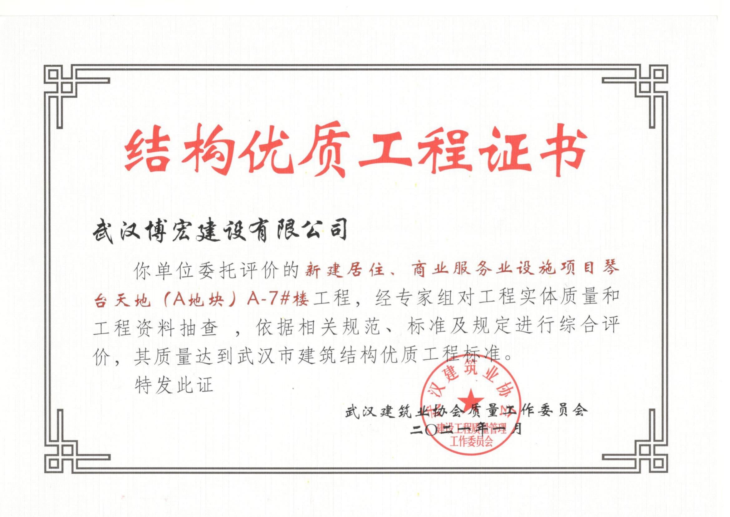 2021年武漢市結構優(yōu)質工程(琴臺天地(A地塊)7棟