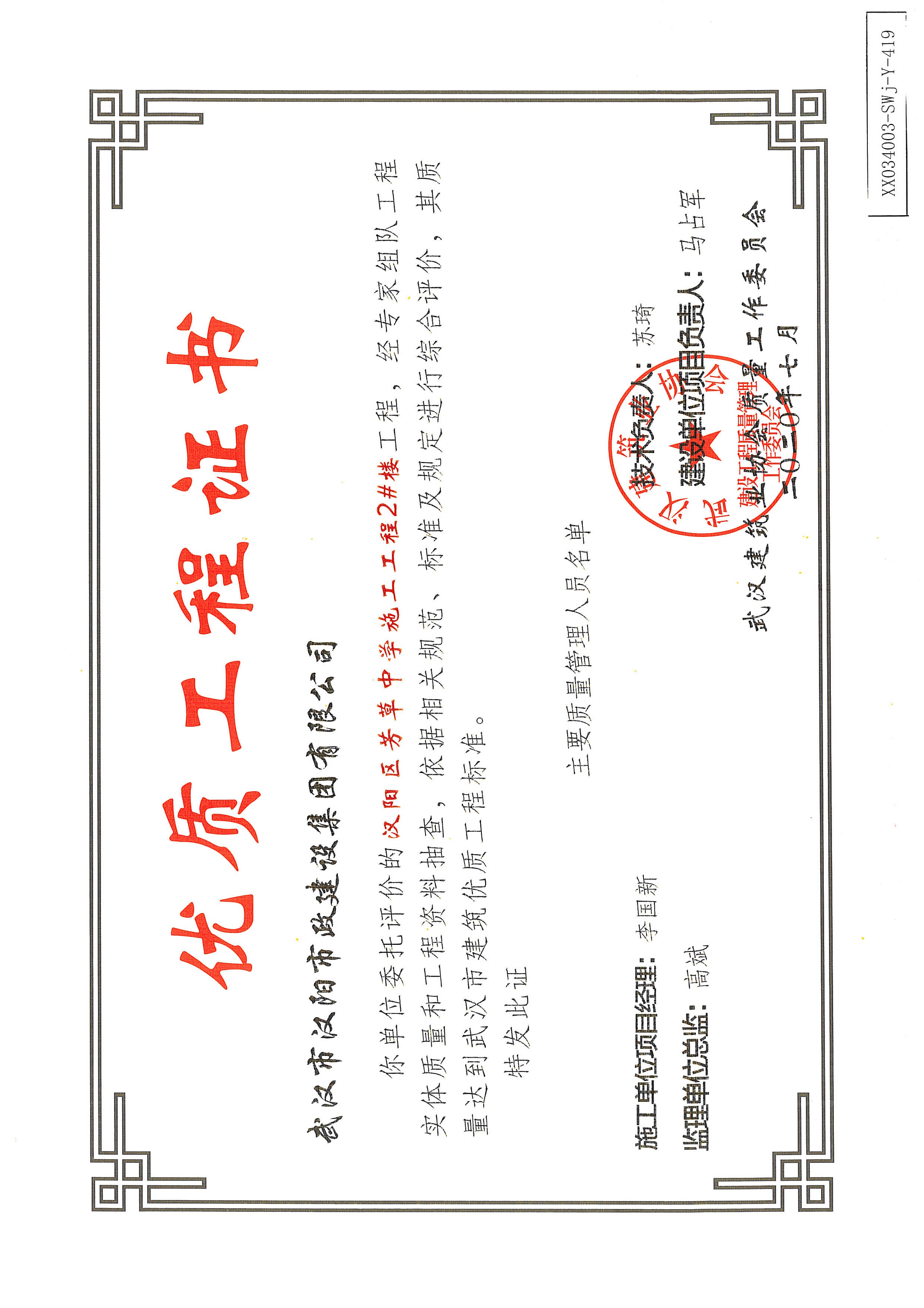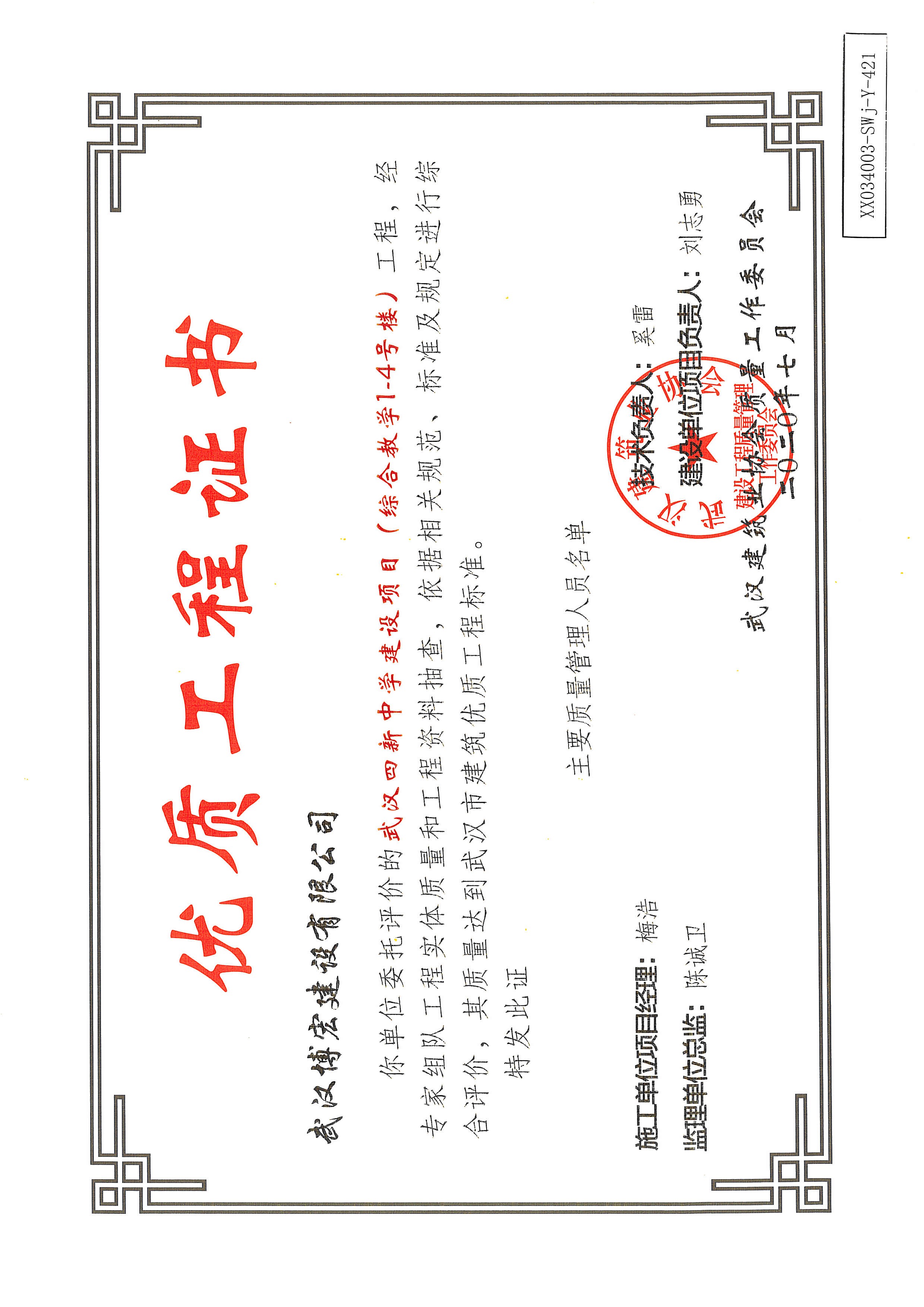 優(yōu)質(zhì)工程證書(武漢四新中學(xué)建設(shè)項目工程(1、2號學(xué)生公寓及食堂)