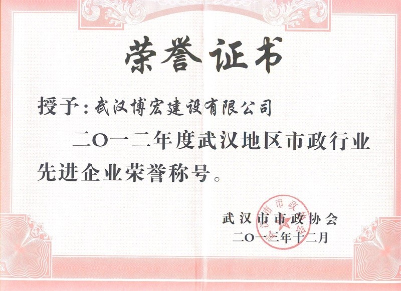 2012年度武漢地區(qū)市政行業(yè)先進(jìn)企業(yè)榮譽(yù)稱(chēng)號(hào)