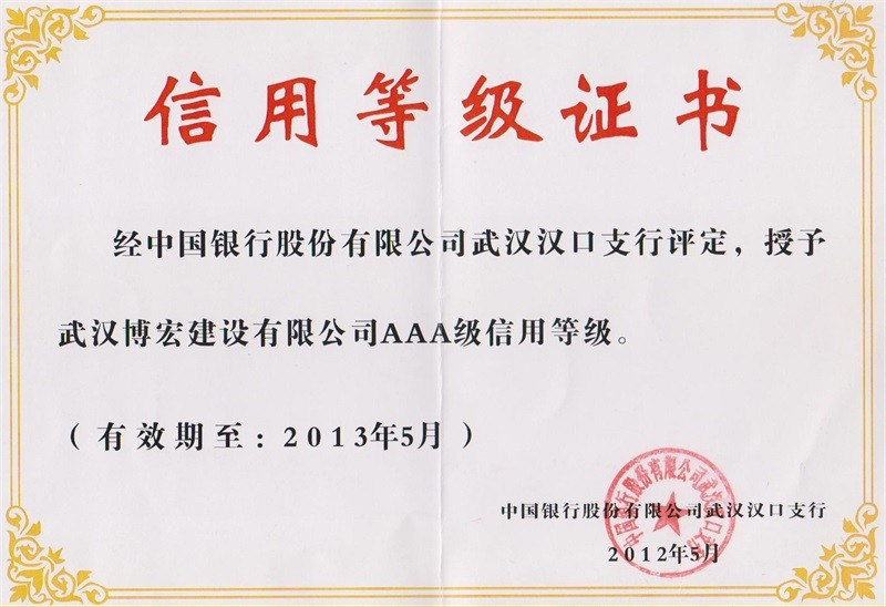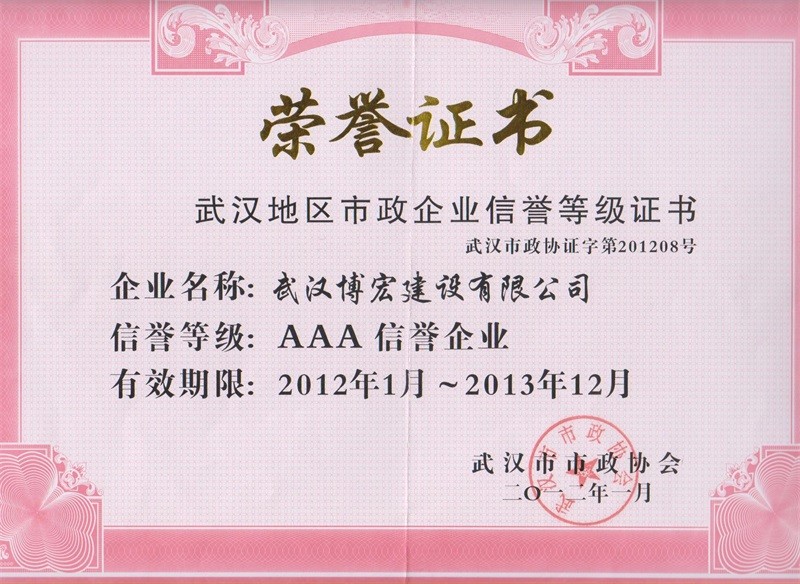 2012-2013年度武漢地區(qū)市政行業(yè)企業(yè)信譽(yù)等級(jí)證書