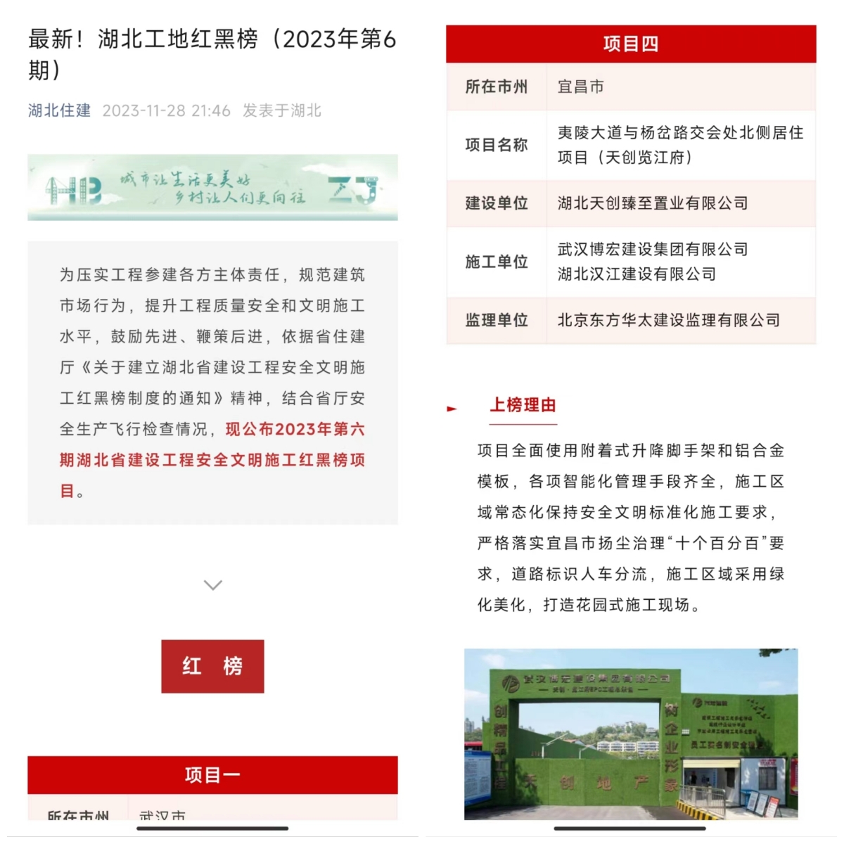 自進(jìn)場(chǎng)施工以來(lái),項(xiàng)目榮登4次宜昌市建筑市場(chǎng)管理紅榜,喜獲宜昌市標(biāo)準(zhǔn)化安薪工地、市安全文明工地等多項(xiàng)榮譽(yù),昨日傳來(lái)喜訊:項(xiàng)目喜上加喜,榮登第六期湖北省建設(shè)工程安全文明施工紅榜。